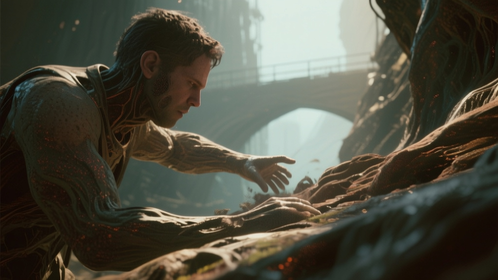 photorealistic 3D render, volumetric lighting, subtle analog film grain, organic texture. A close-up detail or consequence scene from: 'Bridging the📷 Photo by Tech&Space