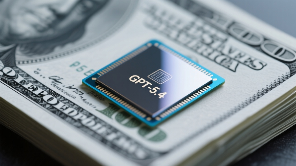 Ultra-macro close-up of a 3mm microchip wafer (etched with 'GPT-5.4') delicately placed atop a crisp, unfolded $100 bill, both centered in the frame.📷 Photo by Tech&Space