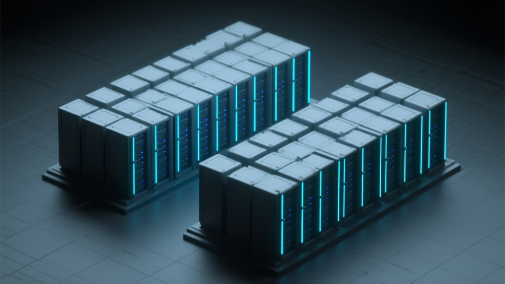 An isometric 3D render of a vast, dimly lit server farm, styled as towering, modular blocks resembling AWS Trainium or Google TPU racks, with linear📷 Photo by Tech&Space