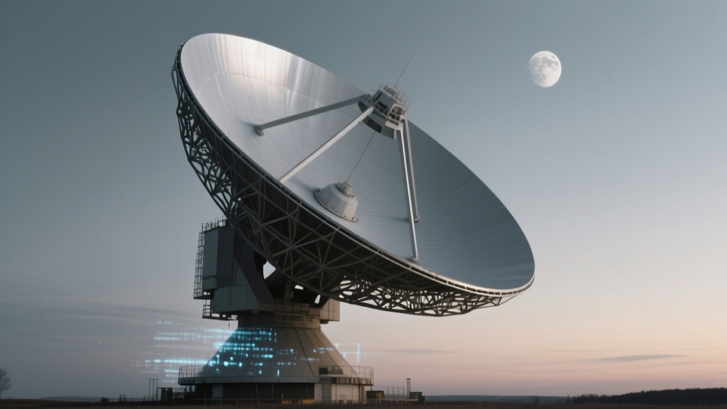 A European Space Agency ground station antenna at dusk, its silver metallic dish towering against a cold lunar grey sky, shallow depth of field📷 Photo by Tech&Space